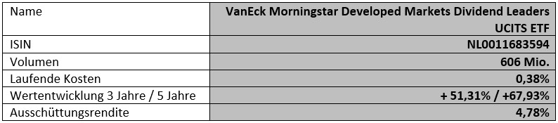 Der VanEck Morningstar Developed Markets Dividend Leader UCITS ETF (NL0011683594) bietet eine Nachbildung des Morningstar Developed Markets Large Cap Dividend Leaders UCITIS ETF, der sich auf Großunternehmen aus Industrieländern konzentriert. Ausgewählt werden für den Morningstar ETF Unternehmen, die sich durch beständige und nachhaltige Dividendenzahlungen auszeichnen. Der Morningstar ETF wird als INDEX von VanEck nachgebildet bzw. repliziert, dies führt auch zu den verhältnismäßig geringen Kosten von 0,38%. Die 10 größten Positionen machen knapp 30% des Portfolios aus, Anlageschwerpunkt sind USA, Frankreich und Japan – somit sind auch hier geopolitische Risiken gut verteilt. Dieser ETF hat eine sehr hohe Wertentwicklung und auch eine hohe Ausschüttung von 4,78%.