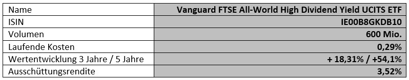 Der Vanguard FTSE All-World High Dividend Yield UCITS ETF (IE00B8GKDB10) ist sehr breit aufgestellt und bildet über 2.100 Unternehmen ab, die weltweit die höchsten Dividendenrenditen haben. Die Rendite des ETF lag in den letzten 5 Jahren bei 54,1%, auf Jahressicht bei 22,7%. Dazu kommt noch die Ausschüttungsquote, die in den letzten 3 Jahren immer über 3,5% gelegen hat.